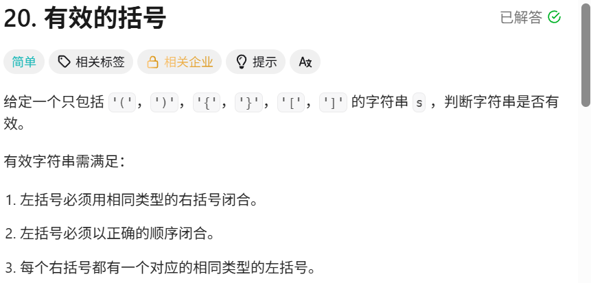class Solution:def isValid(self, s: str) -> bool:dic = {'(':')', '{':'}', '[':']', '?':'?'}st = ['?']for c in s:if c in dic:st.append(c)elif dic[st.pop()] != c:return Falsereturn len(st) == 1