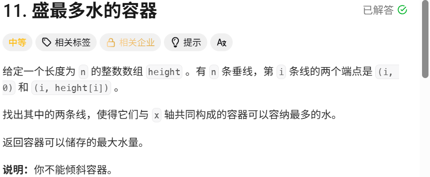 class Solution:def maxArea(self, height: List[int]) -> int:n = len(height)l, r = 0, n - 1ans = 0while l < r:if height[l] < height[r]:ans = max(ans, height[l] * (r-l))l += 1else:ans = max(ans, height[r] * (r-l))r -= 1return ans