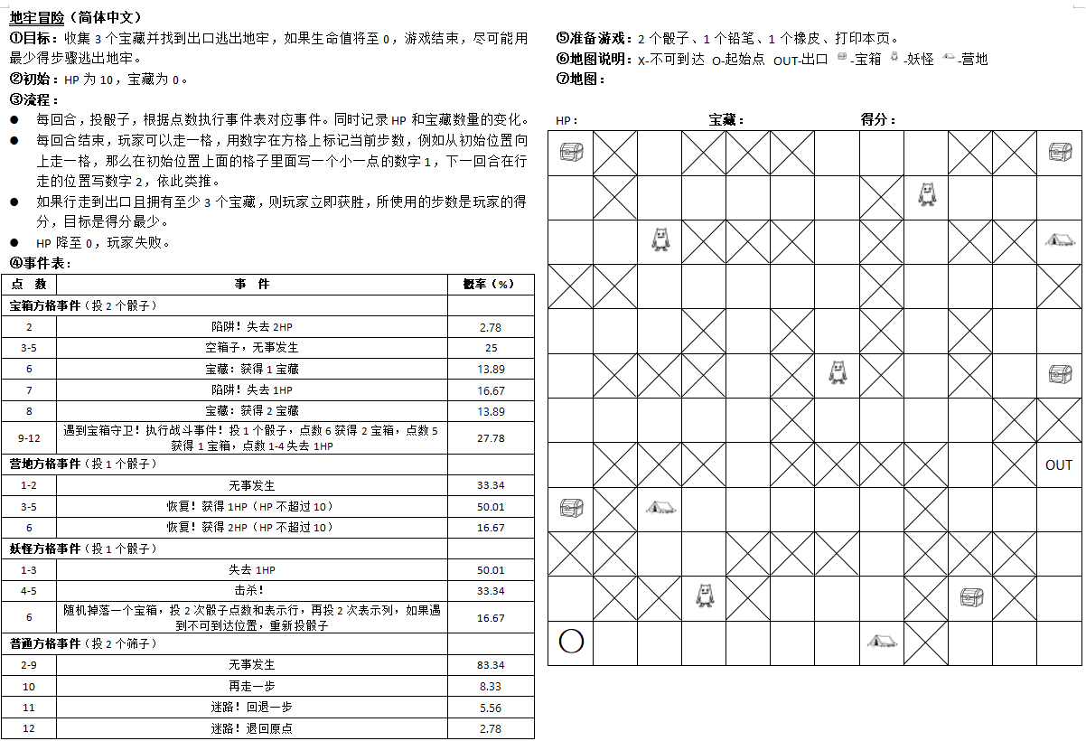 投掷阶段:玩家投掷两枚骰子,根据点数查询“事件表”,并立即结算HP和宝藏的变化。