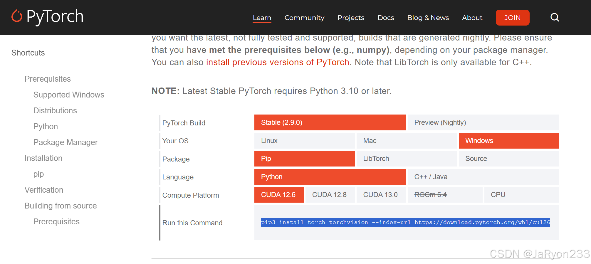 打开 PyTorch 官网(https://pytorch.org/),根据官网提供命令下载安装pytorch。