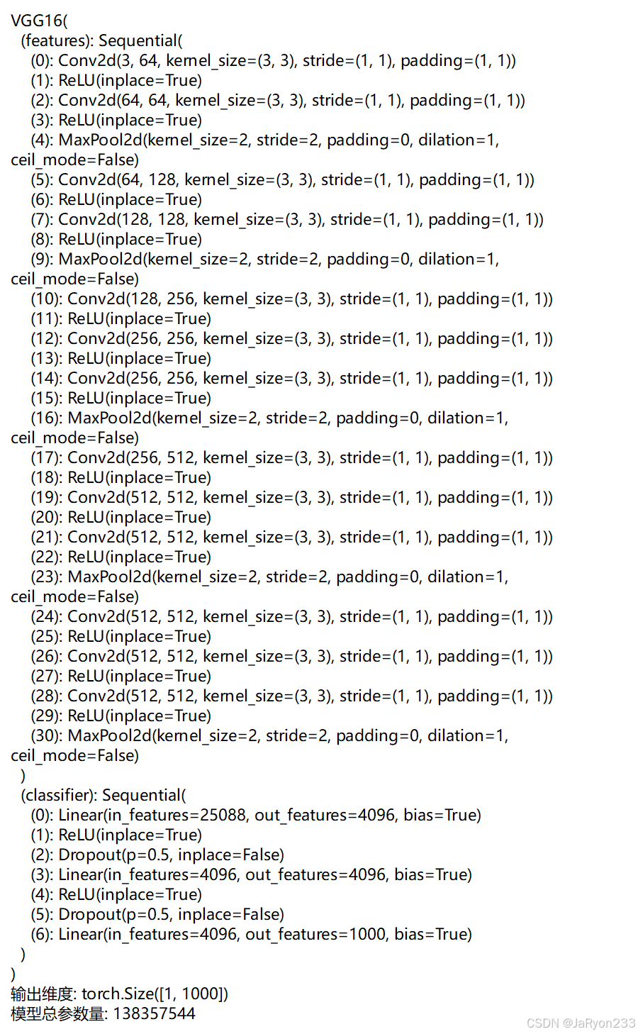 if __name__ == "__main__":model = VGG16(num_classes=1000) # 实例化模型print(model) # 打印模型结构test_input = torch.randn(1, 3, 224, 224) # 随机测试张量output = model(test_input) # 前向传播print(f"输出维度: {output.shape}") # 验证输出维度total_params = sum(p.numel() for p in model.parameters()) # 总参数print(f"模型总参数量: {total_params}")