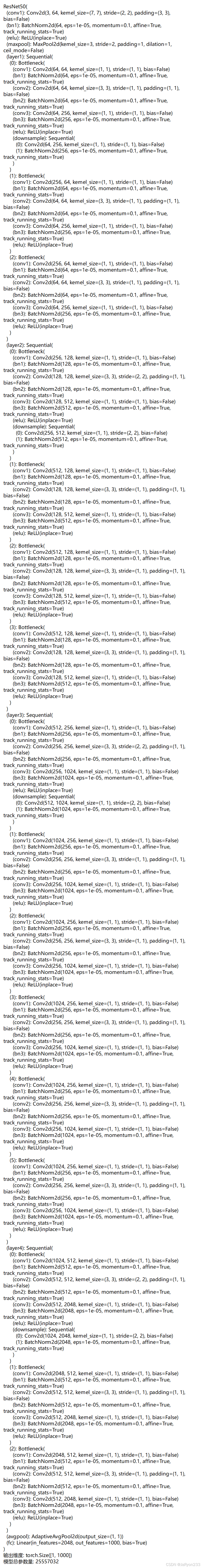 if __name__ == "__main__":model = ResNet50(num_classes=1000)print(model) # 打印模型结构,重点查看残差块组数量test_input = torch.randn(1, 3, 224, 224)output = model(test_input)print(f"输出维度: {output.shape}") # 应为 (1, 1000)total_params = sum(p.numel() for p in model.parameters())print(f"模型总参数量: {total_params}")