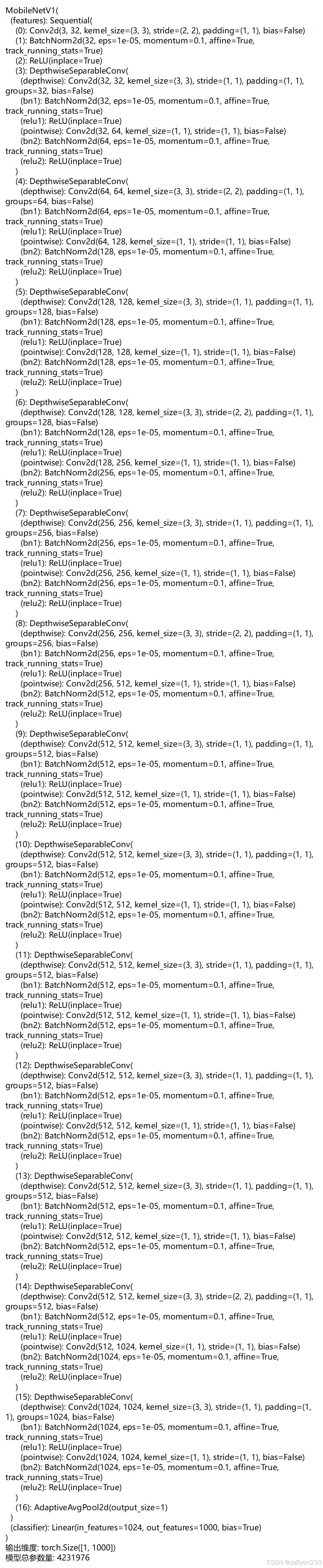 if __name__ == "__main__":model = MobileNetV1(num_classes=1000)print(model)# 随机测试张量x = torch.randn(1, 3, 224, 224)out = model(x)print("输出维度:", out.shape)# 统计模型总参数量total_params = sum(p.numel() for p in model.parameters())print("模型总参数量:", total_params)