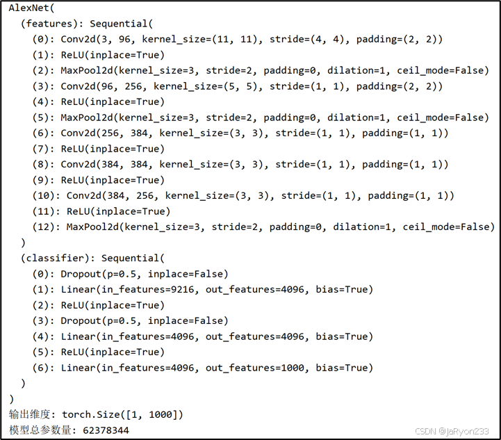 if __name__ == "__main__":num_classes = 1000model = AlexNet(num_classes=num_classes)# 打印模型结构print(model)# 创建随机测试张量 (1x3x224x224)test_input = torch.randn(1, 3, 224, 224)output = model(test_input)print(f"输出维度: {output.shape}") # 应该是 (1, num_classes)# 统计总参数量total_params = sum(p.numel() for p in model.parameters())print(f"模型总参数量: {total_params}")