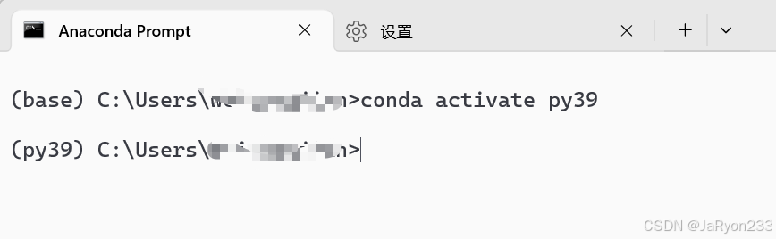 打开 Anaconda Prompt,输入命令conda activate py39(“py39” 为实验一创建的虚拟环境,若环境名不同需替换),激活后命令提示符前会显示 “(py39)”。