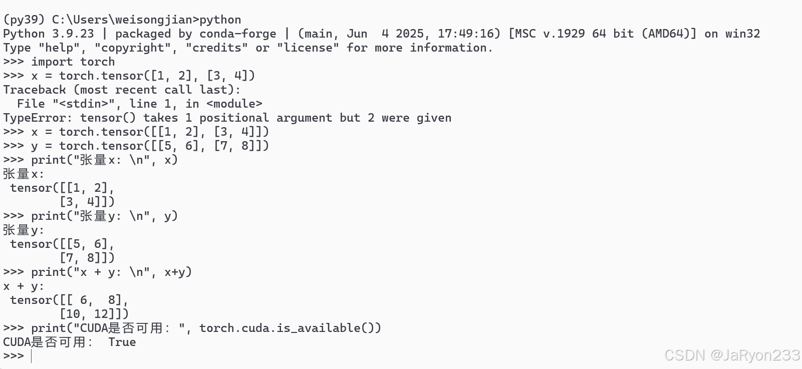 如下图所示,运行结果表示pytorch安装成功,CUDA也确实可用。