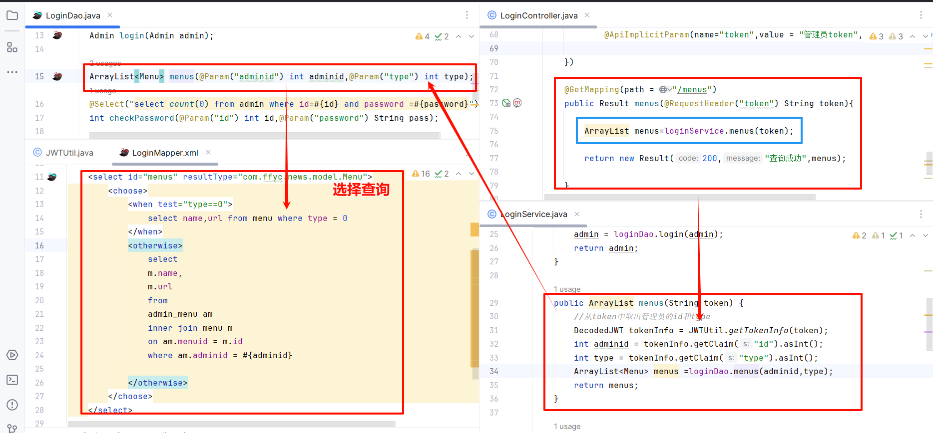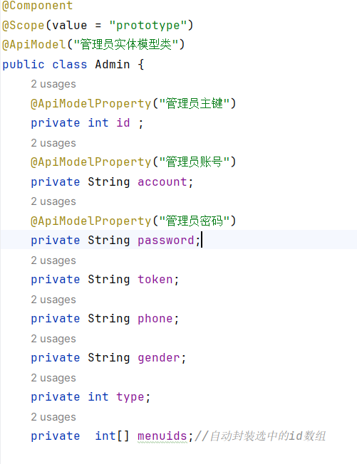 public class LoginController {//日志定义private static Logger logger = LoggerFactory.getLogger(LoginController.class);@Autowiredprivate LoginService loginService;@ApiOperation("管理员登录接口")@ApiResponses({@ApiResponse(code = 200,message = "响应成功"),@ApiResponse(code = 200,message = "响应成功"),@ApiResponse(code = 200,message = "响应成功"),@ApiResponse(code = 200,message = "响应成功"),})@PostMapping(path="/login")public Result login(@RequestBody Admin admin){//日志打印logger.info("enter login method");logger.debug("login account:{},password:{}",admin.getAccount(),admin.getPassword());logger.error("系统忙,请稍后再试");//参数保存admin = loginService.login(admin);//System.out.println(1/0);//判断登录是否成功if(admin==null){return new Result(201,"登录失败",null);}else {//登录成功,为管理员提供tokenString token = JWTUtil.getToken(admin);//为当前admin提供一个tokenadmin.setToken(token);//将提供的token set到 admin对象里面return new Result(200,"登录成功",admin);}}@GetMapping(path = "/test")public String test(){System.out.println("test");return "success";}/**查询管理员菜单*/@ApiOperation("查询管理员权限菜单")@ApiImplicitParams({@ApiImplicitParam(name="token",value = "管理员token",required = true,type = "String")})@GetMapping(path = "/menus")public Result menus(@RequestHeader("token") String token){ArrayList menus=loginService.menus(token);return new Result(200,"查询成功",menus);}}