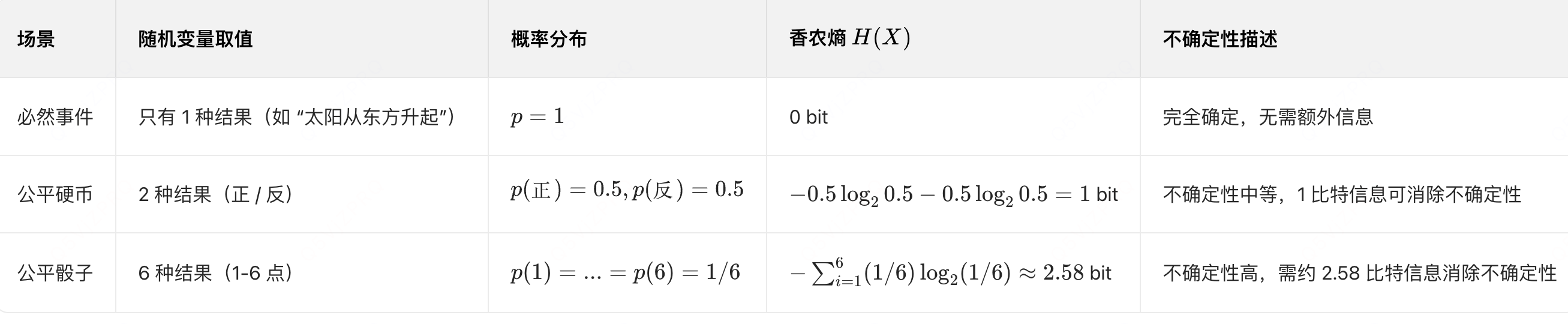 - 单位:公式中若使用以 2 为底的对数(\(\log_2\)),熵的单位为 “比特(bit)”;若用自然对数(\(\ln\)),单位为 “奈特(nat)”,日常场景中 “比特” 最常用。
