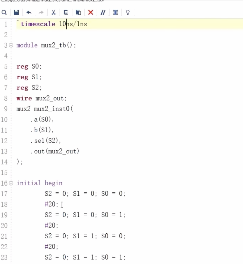 - timescale 是语法标准的保留词,代码仿真时用到的延时语句的单位和精度