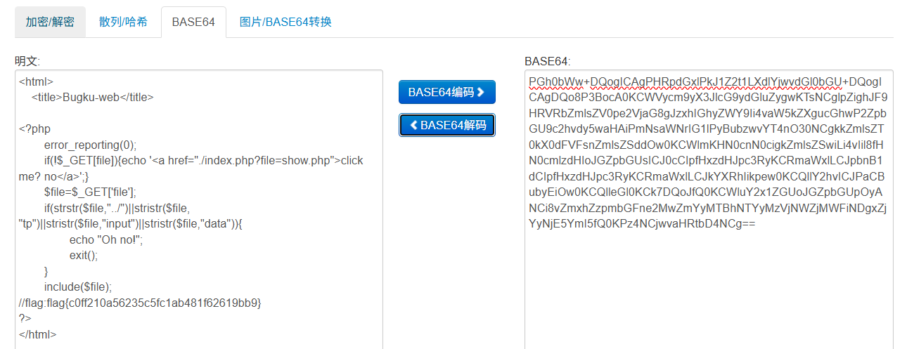 <?phperror_reporting(0);if(!$_GET[file]){echo '<a href="./index.php?file=show.php">click me? no</a>';}$file=$_GET['file'];//如果有get请求的file参数,内容为../、tp、input、data都过滤了if(strstr($file,"../")||stristr($file, "tp")||stristr($file,"input")||stristr($file,"data")){echo "Oh no!";exit();}//包含file文件include($file);