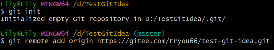 创建一个TestGitIdea文件夹,随后open git bash here,初始化仓库和进行连接