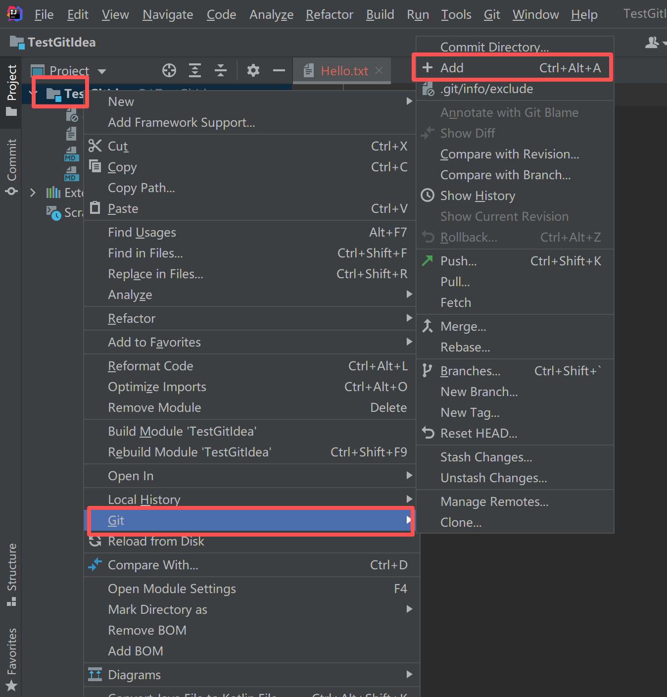 右键项目目录,找到git选项,点击add: