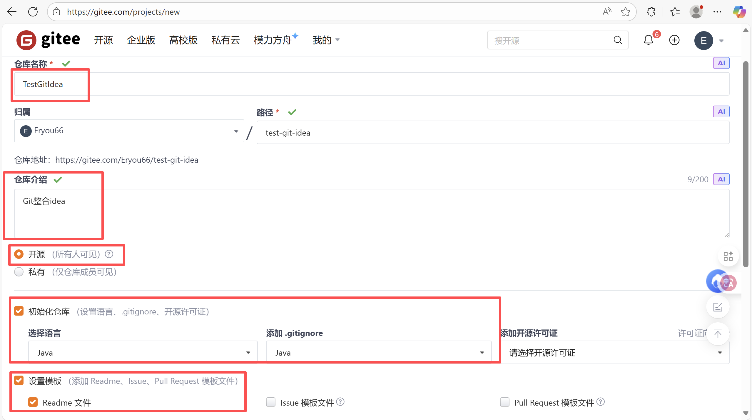 首先在gitee中创建远程仓库