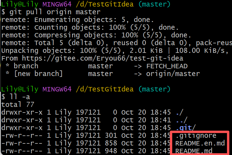 然后拉取远程仓库的模板文件,再ll -a检查一下: