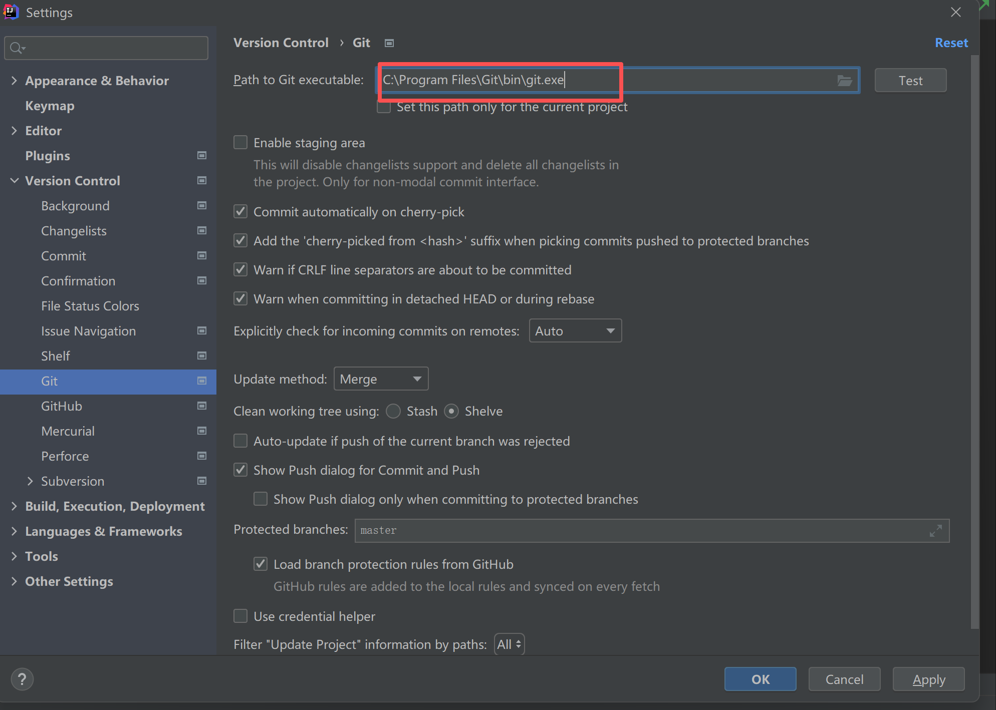 搜索git,在下图所示的Path to Git executable中找到自己安装的git,并且把bin目录下的git.exe路径复制到这里。