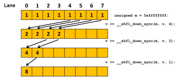 __device__ void warpReduce(float *cache, unsigned int tid) {int v = cache[tid] + cache[tid + 32];v += __shfl_down_sync(FULL_MASK, v, 16);v += __shfl_down_sync(FULL_MASK, v, 8);v += __shfl_down_sync(FULL_MASK, v, 4);v += __shfl_down_sync(FULL_MASK, v, 2);v += __shfl_down_sync(FULL_MASK, v, 1);cache[tid] = v;