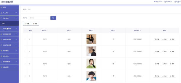 知识管理系统的管理员可以对用户新增,修改,删除,查询操作。具体界面的展示如图所示。