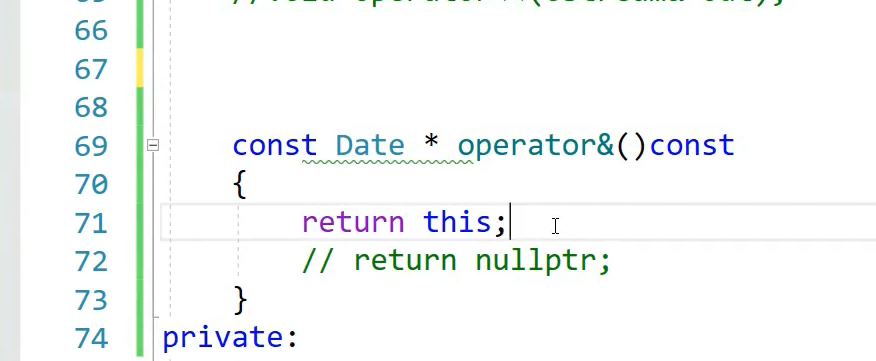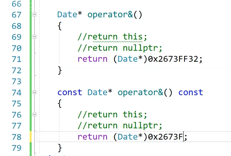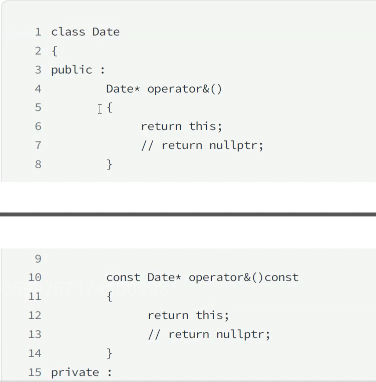 一般不需要写,系统库自动就支持了,取地址运算符不需要重载,他是默认成员函数,实际上默认生成就够用。为什么写两个,普通对象返回Date*,const对象返回constDate*