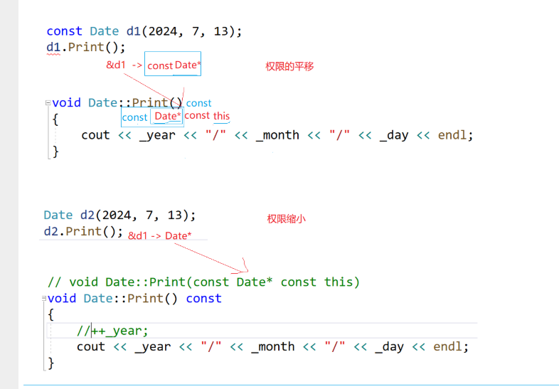 这里Date*给Date*权限没有变化,这是修饰指针本身,不用管,不涉及权限放大缩小,修饰对象本身不会有问题