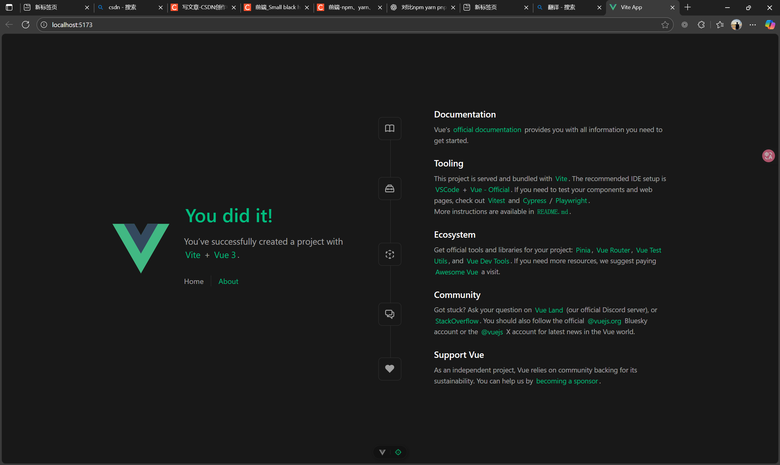 使用ctrl+鼠标右键点击链接进入网页,显示以下网页表明Vue3项目搭建成功。