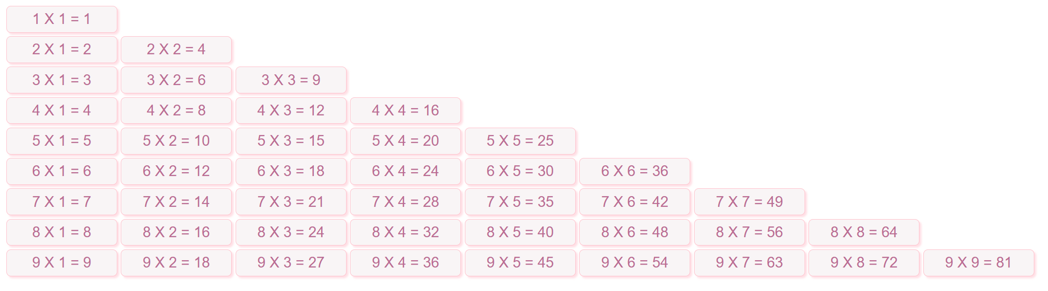 // 外层打印几行for (let i = 1; i <= 9; i++) {// 里层打印几个星星for (let j = 1; j <= i; j++) {// 只需要吧 ★ 换成 1 x 1 = 1 document.write(`<div> ${j} x ${i} = ${j * i} </div>`)}document.write('<br>')}