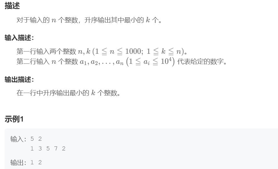 public static void main(String[] args) {Scanner scanner = new Scanner(System.in);// 读取n和kint n = scanner.nextInt();int k = scanner.nextInt();// 读取n个整数int[] arr = new int[n];for (int i = 0; i < n; i++) {arr[i] = scanner.nextInt();}// 对数组进行排序Arrays.sort(arr);// 输出前k个最小的数for (int i = 0; i < k; i++) {System.out.print(arr[i]);if (i < k - 1) {System.out.print(" ");}}}