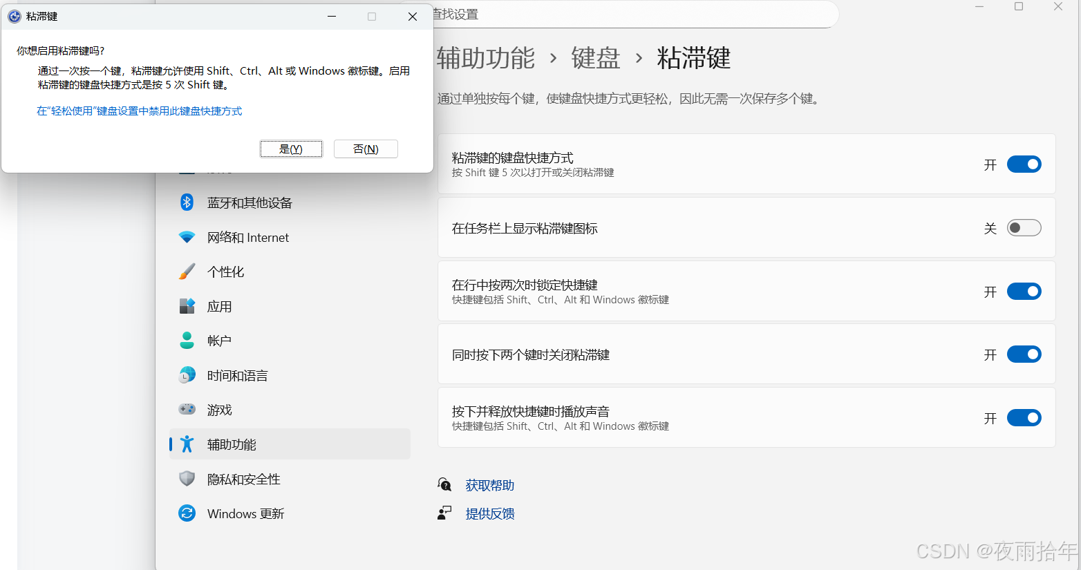 在搜索栏中搜索粘滞键,通过连按五下shift关闭