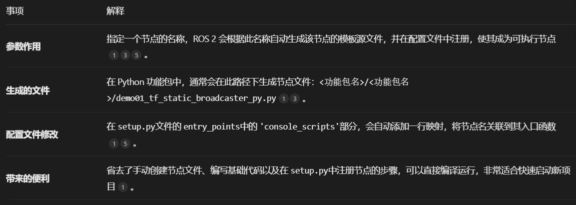 作用是创建一个pyhton版本的py03_tf_broadcaster功能包,并依赖于rclpy tf_transformations tf2_ros geometry_msgs turtlesim,并创建一个名为demo01_tf_static_broadcaster_py的节点