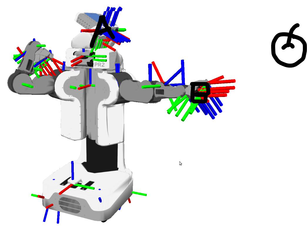 我们把A坐标系下的苹果坐标跟A与B坐标系的相对关系作为输入,输入到TF中,得到的输出就是B坐标系下的苹果坐标.