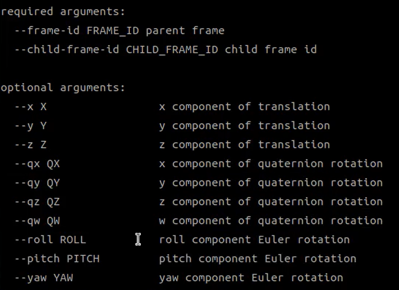 ros2 run tf2_ros static_transform_publisher -- frame-id base_link