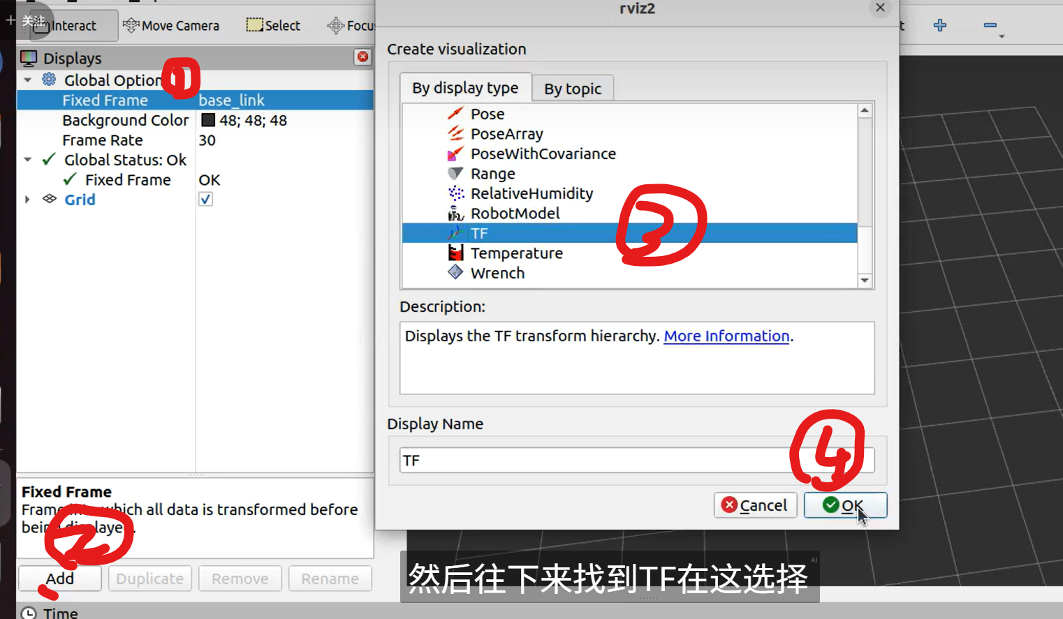 (2)打开新终端,输入rviz2,打开可视化界面,查看坐标系