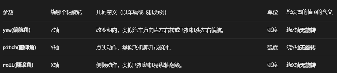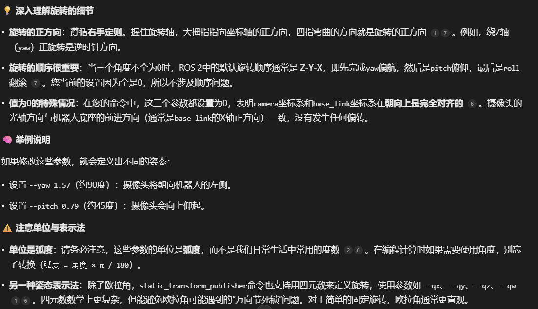 ros2 run tf2_ros static_transform_publisher --x -0.5 --y 0 --z 0.4 --yaw 0 --roll 0 --pitch 0 --frame-id base_link --child-frame-id camera #--yaw 0 --roll 0 --pitch 0表示什么