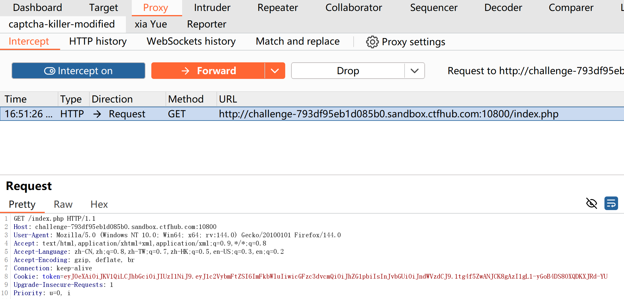 新建一个终端导入python3的环境,把algorithm变为none,复制生成的token,在bp上修改token,forward回去浏览器得到flag