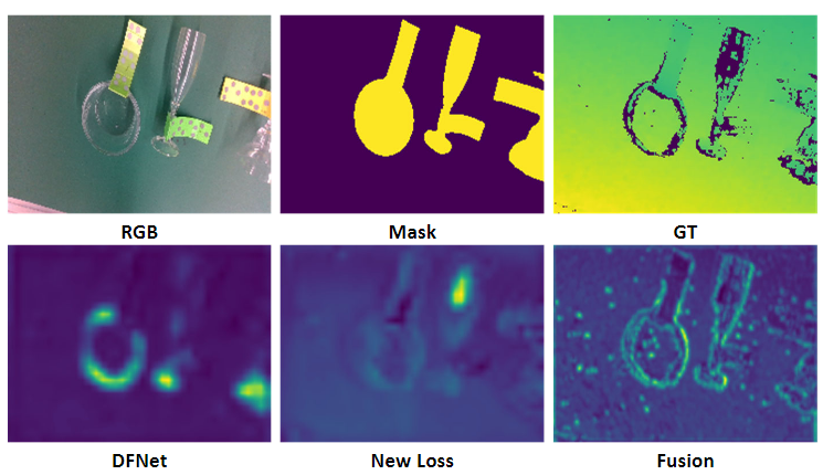 1)损失项的影响:如III-D所述,不稳定的像素会对训练损失的计算产生显著的负面影响。为了说明这个问题,我们手动创建了一个特征来表示这些像素,通过计算深度图像的梯度并应用高斯模糊。通过减少这些像素的权重,我们观察到模型的性能有所提高(如表 V 中的权重实验所示),突出了以不同的方式处理像素的重要性并强调使用的损失函数的必要性(尤其是 Huber 损失)。定性地,如图 6 所示,New Loss 模型更加强调透明物体的整体结构,而 DFNet 主要关注局部信息。这种损失函数的缺点是网络可能忽略一些细节。