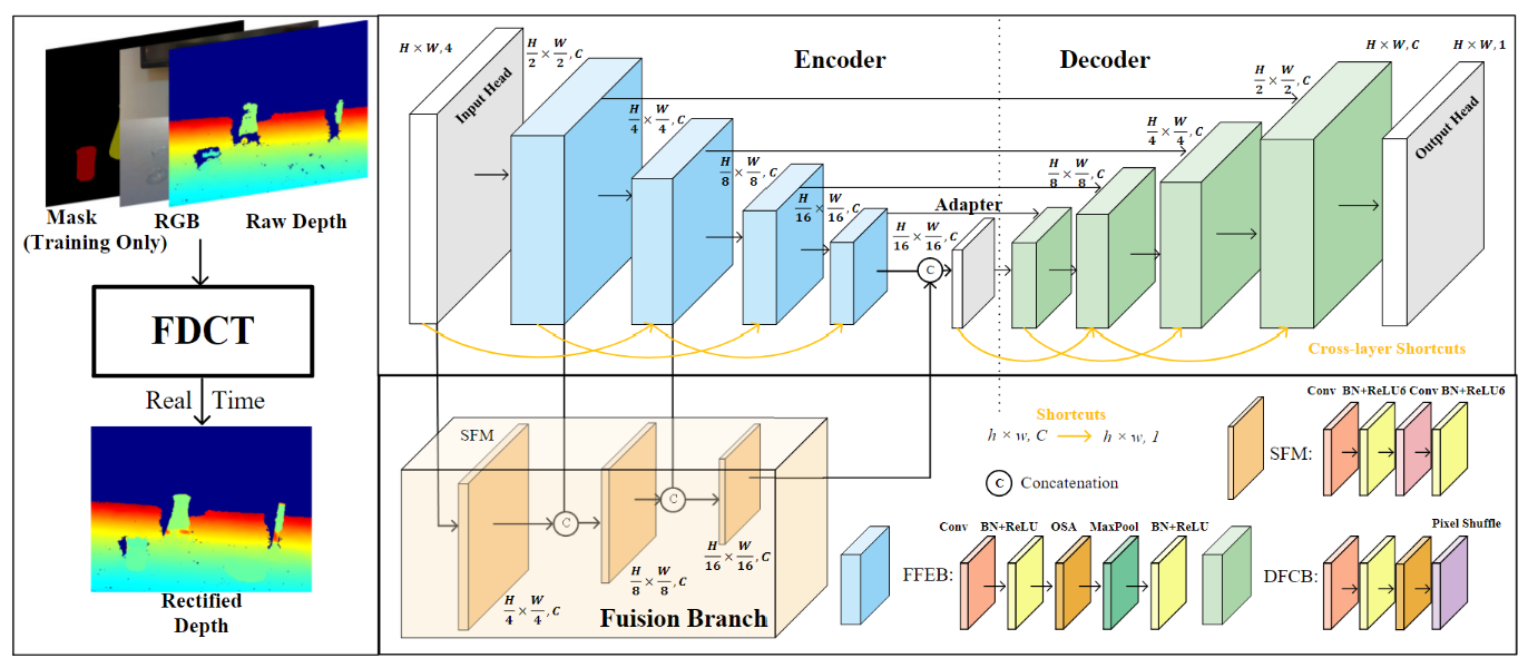 FDCT 的编码器由两部分组成:主要部分由特征融合和提取块 (FFEB) 构建,而子部分称为融合分支,由一系列快捷连接模块 (SFM) 构建。主编码器和子编码器协同工作,为解码器提供聚合特征,保留低级信息,例如像素位置。此外,解码器由深度融合和完成块 (DFCB) 构建。在我们的工作中,通过域适应操作将其提供给每个FFEB和DFCB,可以有效地准确地利用原始深度图像。这与以前的工作不同,这些工作要么使用网络基于原始深度信息[7]、[8](导致耗时的两阶段处理)预测透明掩码,要么直接将原始深度连接到特征[9](导致对噪声和不准确的敏感性)。