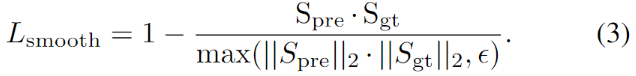 3)平滑损失:平滑损失LSmooth由表面法线Spre和Sgt之间的余弦相似度决定,分别由预测深度和地面真实深度计算。添加了一个小值 푡 以防止除法为零。平滑损失Lsmooth对图像边缘进行建模,并在像素级[9]、[11]上执行: