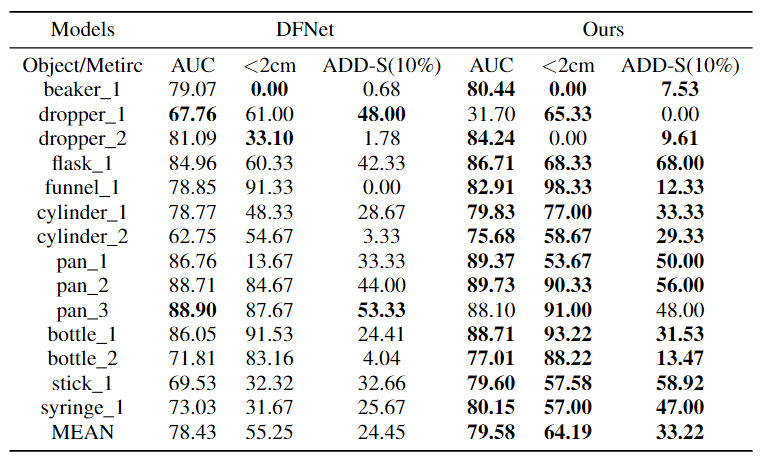 在本实验中,我们旨在展示我们的网络对下游任务的适用性,并表明它可以提高姿态估计的准确性。为了评估姿态估计的性能,我们使用了三个评估指标,即平均最近点距离 (ADD-S)、ADD-S 曲线下的面积 (AUC) 和小于 2 cm 的 ADD-S 值的百分比。