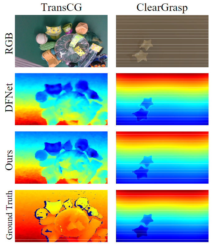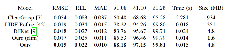 最近,Fang等人[9]提出了一种用于透明物体(DFNet)的大规模真实数据集TrascCG和深度完井网络,它采用U-Net架构,使用一个名为DenseBlock[19]的轻量级骨干,并在较小的内存使用和模型大小下实现SOTA性能。