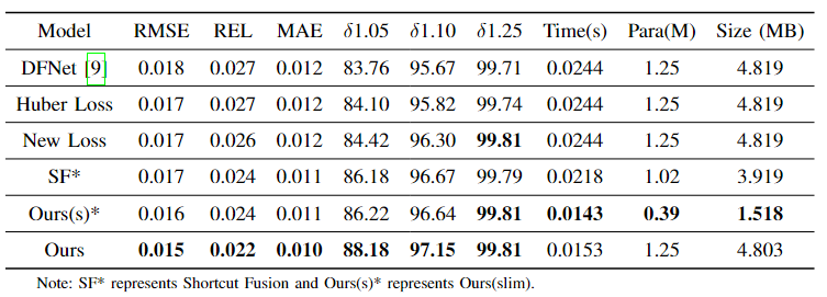1)损失函数:DFNet的训练采用均方误差(MSE)和平滑损失作为其损失函数。然而,这些简单的损失函数会导致局部特征的过度拟合,这使得模型对边缘和位置等低级特征的噪声更敏感,从而对其准确性产生负面影响。为了验证我们提出的损失函数,我们首先将 MSE 损失替换为 DFNet 中的 Huber 损失,并将其称为 Huber 损失。然后,我们用我们的(表 I 中的新损失)替换了 DFNet 的损失函数,使所有其他方面保持不变。通过比较表 I 中的第一行,我们观察到使用 Huber 损失的重要性。通过将 New Loss 与 DFNet 进行比较可以进一步观察到,所有指标都显示出改进,而不需要任何额外的参数。