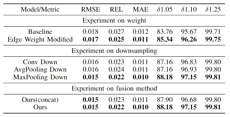 在我们提出的方法中,损失函数在使网络能够专注于结构信息并减轻不稳定像素的影响方面起着至关重要的作用。然而,这种对结构信息的关注可能会以牺牲一些细节为代价。另一方面,融合分支和快捷方式会关注细节,这可能会引入额外的冗余。尽管如此,maxpooling 的使用促进了有损和激进的下采样,可以减少冗余并提高鲁棒性。基于卷积的融合方法更好地利用原始深度图像。所有组件协同工作并相互补充,以在结构信息和细节之间实现最佳平衡。我们分析了我们方法的四个关键组件并证明了它们的有效性: