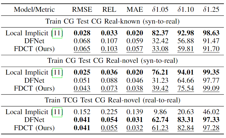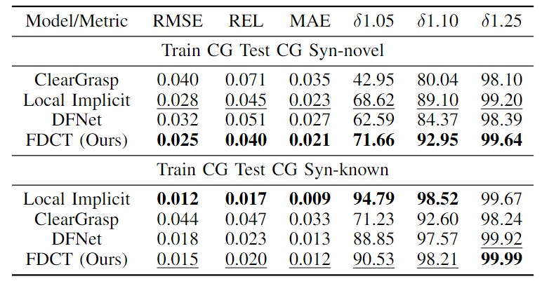 3) FDCT 在使用更少的参数并以大约 70 FPS 的速度运行的同时,比最先进的深度补全方法至少高出 16%。实验结果表明,FDCT有利于位姿估计和抓取任务。