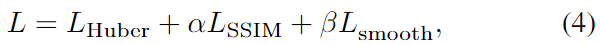 为了解决这些问题,我们引入了以下损失函数,该函数主要利用Huber损失,SSIM损失和平滑损失作为惩罚项。我们在分析部分证明了所提出的损失函数的必要性。所有损失都是在透明区域上计算的。