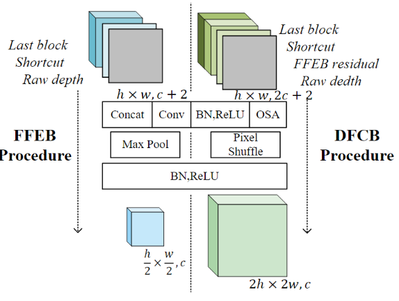 1) 特征融合和提取块:主干在确定架构效率方面起着至关重要的作用。尽管DenseNet[19]已被证明在以前的工作[9]中是有效的,但它可能是资源密集型的,它的浅层可能对结果[37]没有太大贡献,这使得它不适合深度补全任务。为了解决这些问题,我们采用一次性聚合模块(OSA)[37]作为骨干来有效地提取特征。编码器由四个特征融合和提取块(FFEBs)组成,如图3左侧所示。每个FFEB采用原始深度图、前一个块的特征和一层的快捷方式作为输入。这些特征通过数据级融合连接和处理。具体来说,我们使用卷积操作来强制它们在低维空间中融合。这种融合方法可以减少深度特征与原始深度图像[38]之间的域差距。我们将在第 IV-F 节中进一步证明它比直接连接效果更好。
