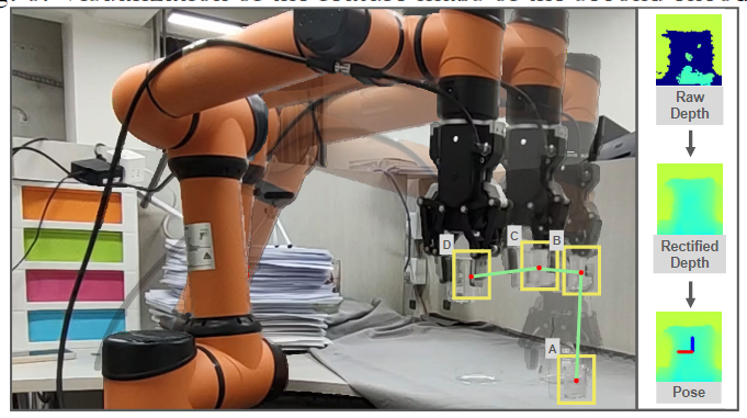 第一项专注于透明物体深度补全的工作是ClearGrasp[7],它使用透明掩码来修改原始深度图像。他们还构建了第一个透明对象数据集,用于深度补全和姿态估计。DepthGrasp [8] 将全局优化部分替换为对抗神经网络,并引入光谱残差块进行稳定性。这两种方法都计算量大,需要正常信息,获取不方便,这使得它们对于实时应用不切实际。局部隐式[11]在射线-体素对上构建局部隐式神经表示,并迭代地细化深度。它还引入了一个大规模的合成数据集 Omniverse。他们的工作显着提高了深度补全的速度。TranspareNet[18]结合了深度补全和点云补全,利用失真深度构建点云,并将其补全为深度的粗略表示。