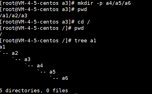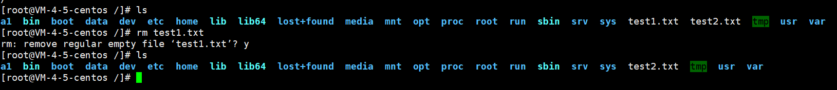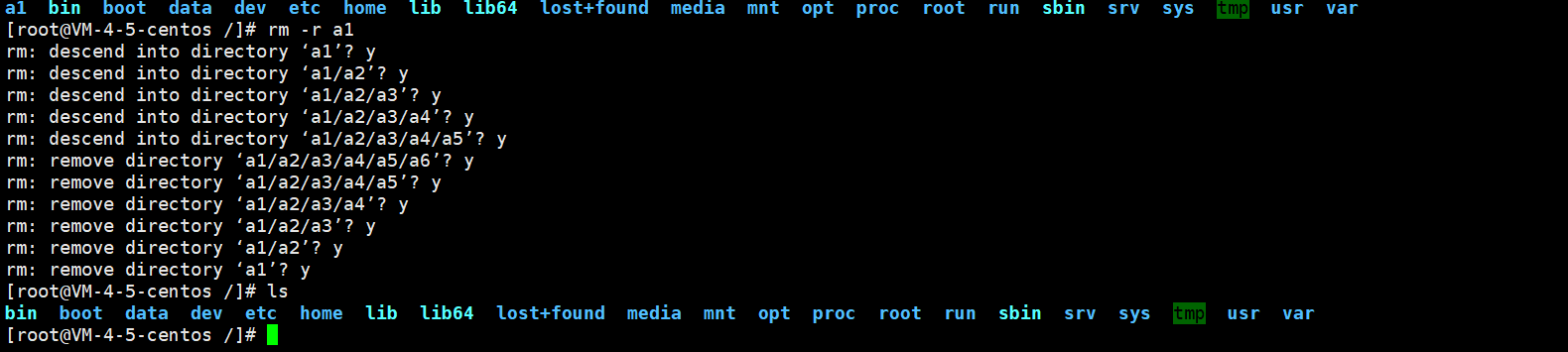 - 在这个图中,我们可以很明显看到他这是递归删除的,当然,我们也可以强制删除(rm -rf a1),直接删除a1,不用走这些递归