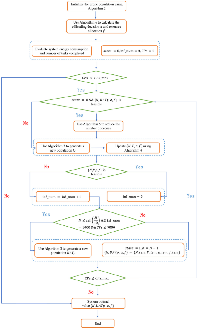针对多无人机部署与任务调度的变长优化难题,DSHSGSK算法创新性地采用固定长度编码方案,将无人机位置坐标编码存储于和声记忆库,从而将问题转化为定长优化。该算法通过淘汰算子动态优化无人机数量,并通过更新算子调整无人机位置,二者由状态变量state智能切换,在确保任务完成的前提下,协同实现系统能耗最小化的目标。