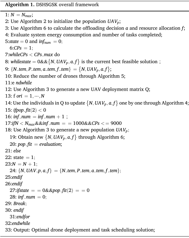 在多无人机辅助移动边缘计算(MEC)领域,无人机部署与任务调度的联合优化已成为在保障移动用户服务质量的同时降低系统能耗的有效手段。然而,该方案实施过程中面临无人机部署与任务调度复杂耦合关系的严峻挑战,为此,本文提出了遗传模拟退火与知识共享双阶段混合策略算法(DSHSGSK),其采用HS-GSK交替优化策略,并引入淘汰算子,以实现无人机部署与任务调度的同步优化。为提升无人机部署效率并构建更有效的任务调度策略,论文创新性地设计了无人机位置编码方案。为融合和声搜索算法的局部搜索能力与基于知识获取共享算法的全局搜索优势,通过引入协调参数调控两种优化技术的交替频率。
