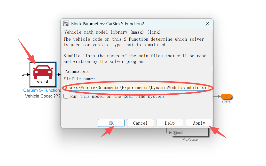 右键点击小车,选第一个“属性”--选“Dynamics”--用户自定义--C:\Users\Public\Documents\Experiments\DynamicModel\Extensions\Simulink\CarSim_VehicleDynamics.mdl----apply----OK