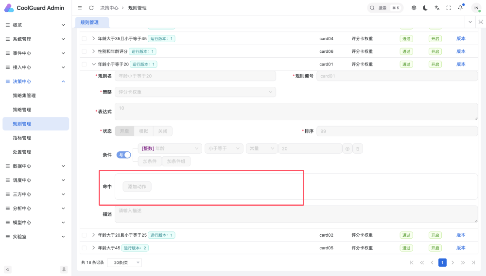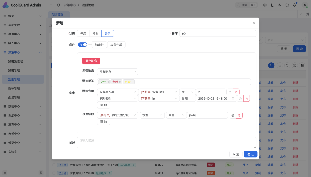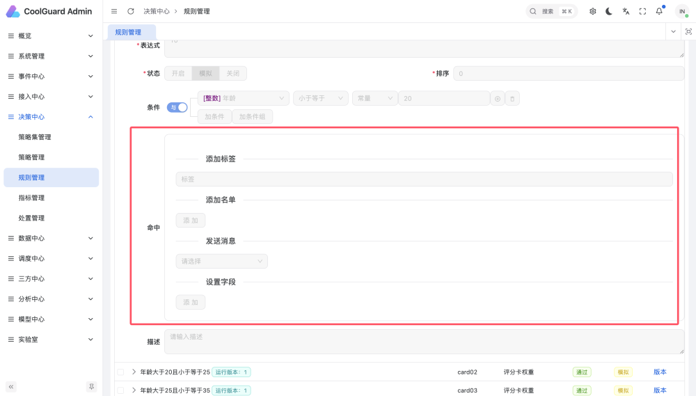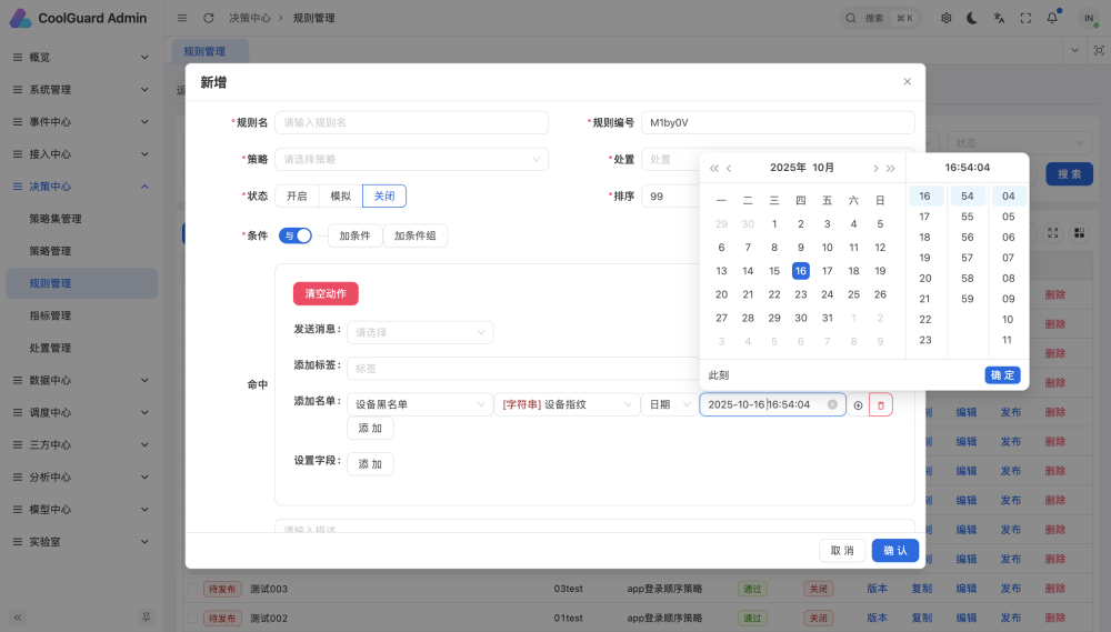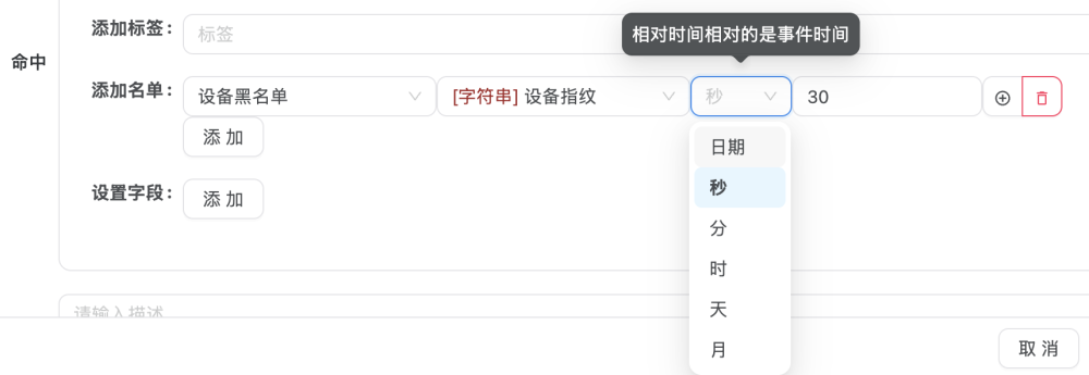 规则命中动作,添加名单时选择名单集和字段,加上了过期时间配置,有两种