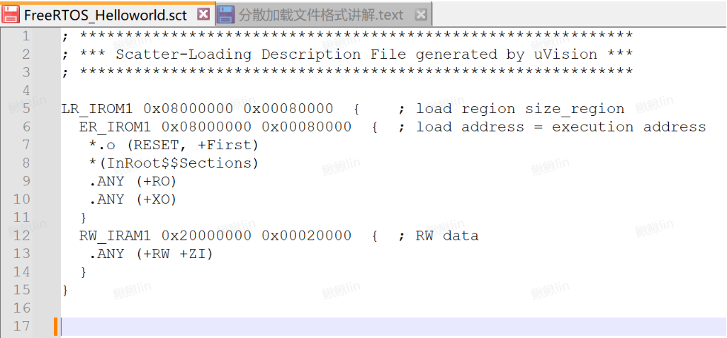 分散加载文件通常以.sct结尾,英文名是:Linker Control File,scatter loading,链接器根据这个文件的配置来分配各个节区的地址空间,并且生成分散加载代码,因此我们只要修改分散加载文件,链接器就能自动帮我们确定代码、变量等这些内容在内存中(Flash和RAM上)的地址。